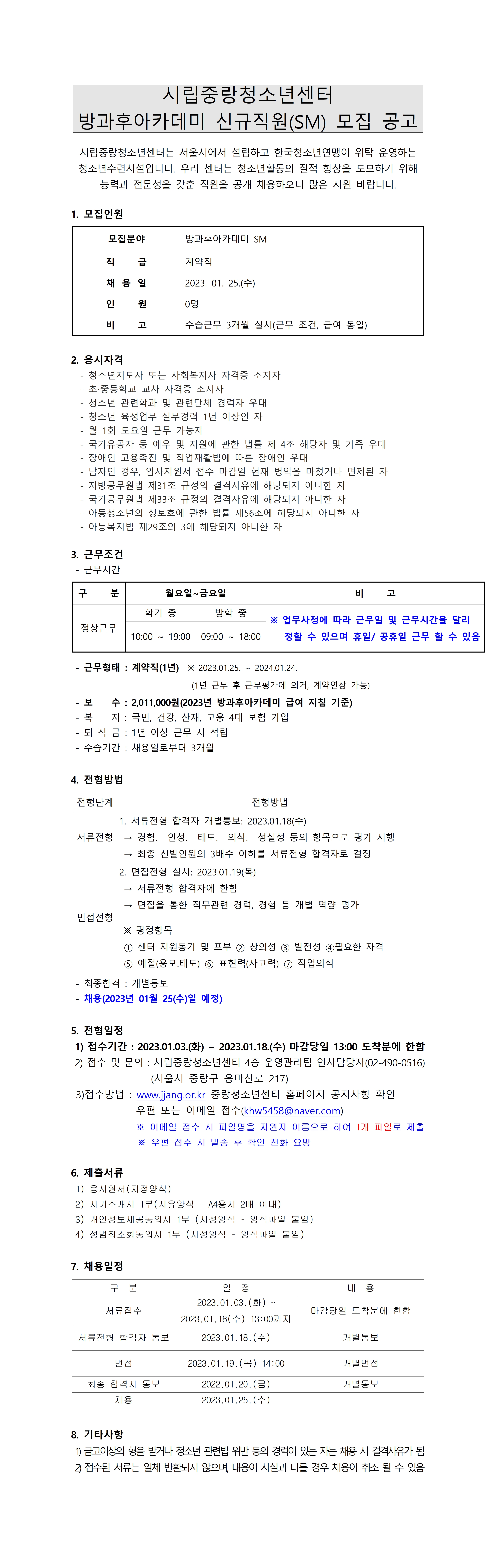 시립중랑청소년센터 방과후아카데미 신규직원(sm) 모집 공고 페이지 정보 작성자 운영자 댓글 0건 조회 2,485회 작성일 23-01-03 15:17 목록 본문 페이스북 공유 트위터 공유 이전글시립중랑청소년센터 신규직원(청소년활동) 최종 합격자 공고 23.01.04 다음글시립중랑청소년센터 신규직원(청소년활동) 1차 서류 합격자 공고 23.01.02 댓글 0 댓글목록 등록된 댓글이 없습니다.