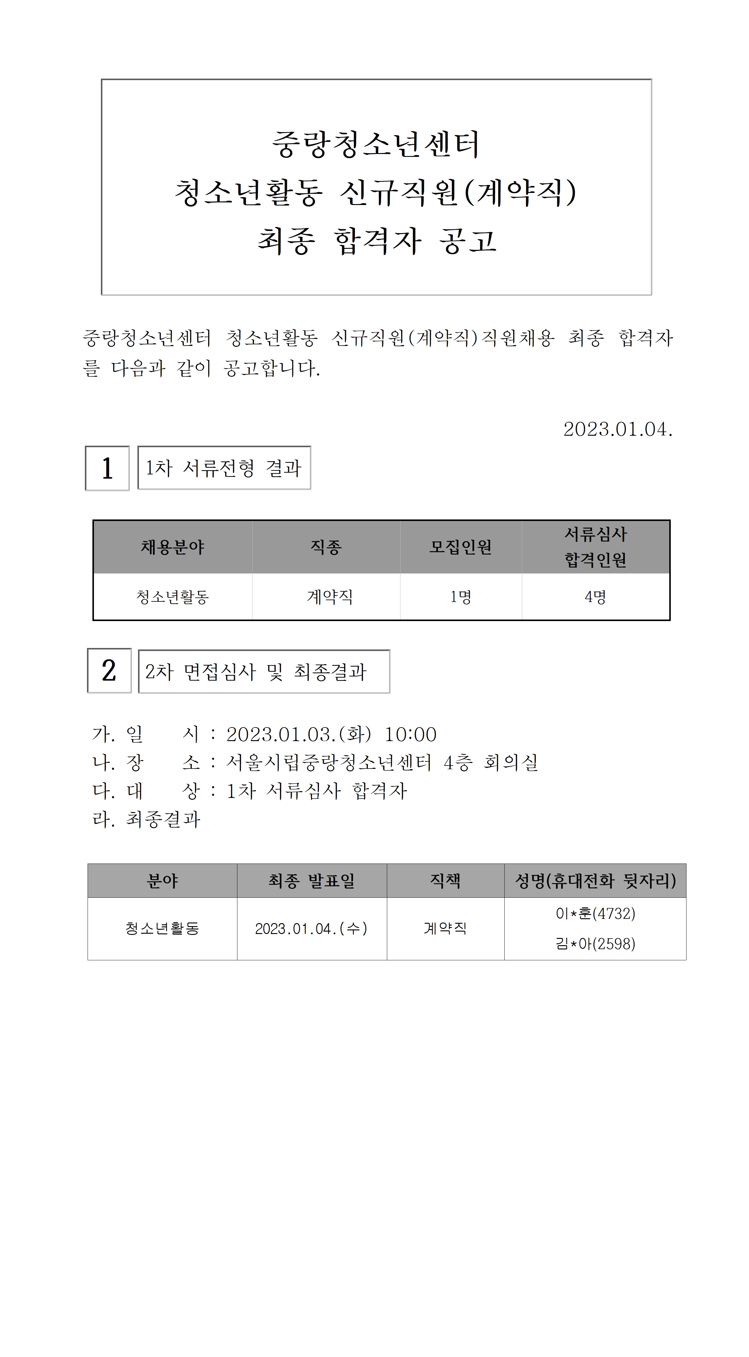 시립중랑청소년센터 신규직원(청소년활동) 최종 합격자 공고 페이지 정보 작성자 운영자 댓글 0건 조회 2,462회 작성일 23-01-04 18:11 목록 본문 페이스북 공유 트위터 공유 이전글시립중랑청소년센터 방과후아카데미 신규직원(SM) 1차 서류 합격자 공고 23.01.18 다음글시립중랑청소년센터 방과후아카데미 신규직원(sm) 모집 공고 23.01.03 댓글 0 댓글목록 등록된 댓글이 없습니다.