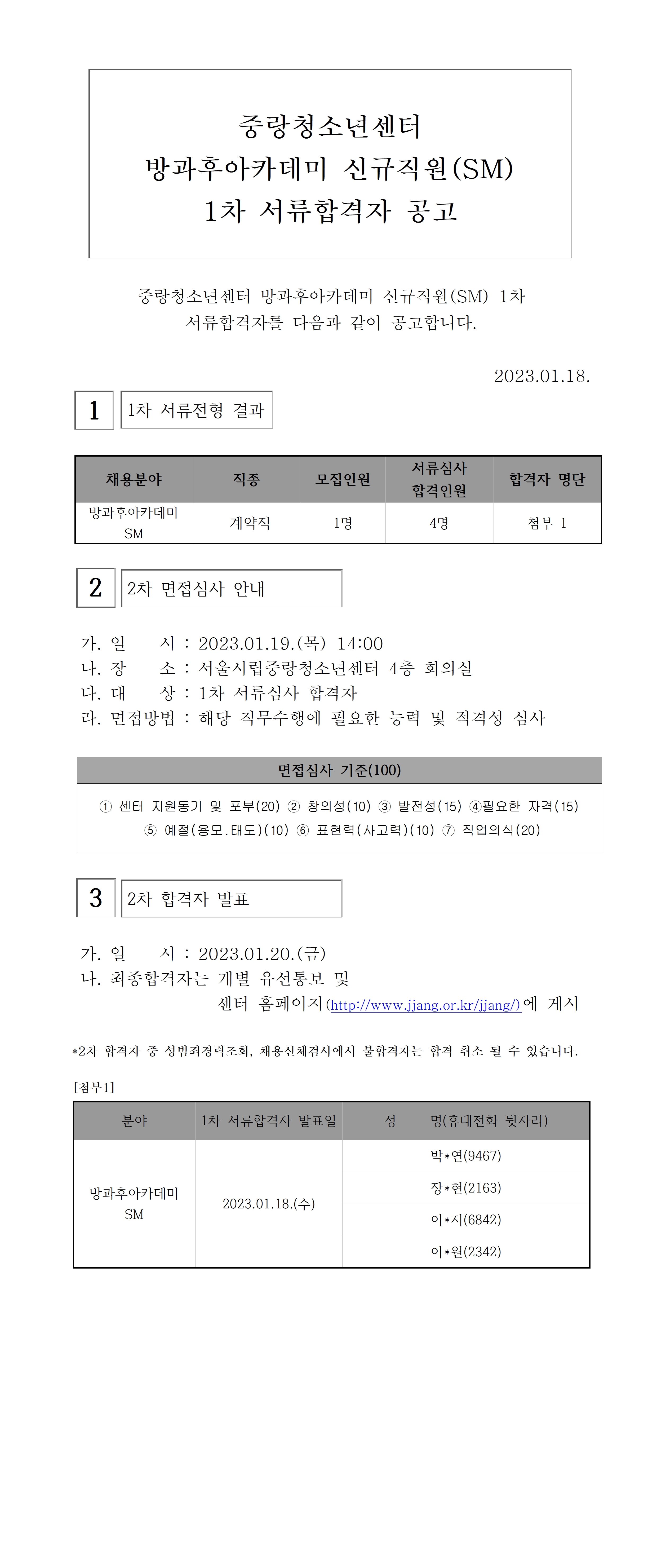 시립중랑청소년센터 방과후아카데미 신규직원(SM) 1차 서류 합격자 공고 페이지 정보 작성자 운영자 댓글 0건 조회 2,207회 작성일 23-01-18 14:58 목록 본문 페이스북 공유 트위터 공유 이전글시립중랑청소년센터 방과후아카데미 신규직원(SM) 최종 합격자 공고 23.01.25 다음글시립중랑청소년센터 신규직원(청소년활동) 최종 합격자 공고 23.01.04 댓글 0 댓글목록 등록된 댓글이 없습니다.