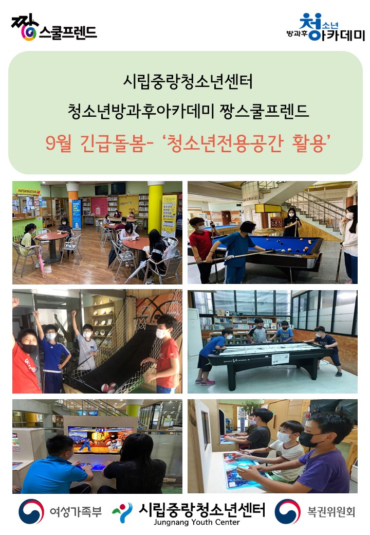 - 짱스쿨프렌드 9월 긴급돌봄 - 청소년전용공간 활용