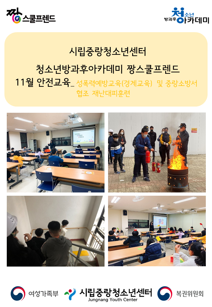 - 짱스쿨프렌드 11월 안전교육 – 성폭력예방교육(경계교육) 및 중랑소방서 협조 재난대피훈련