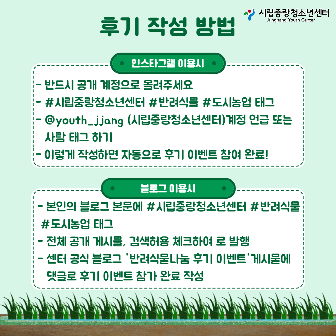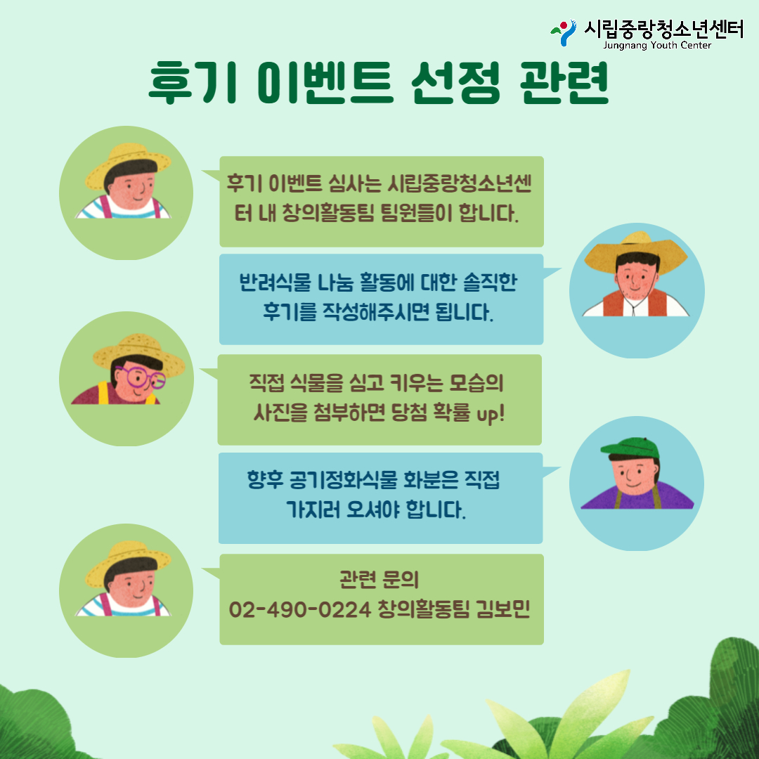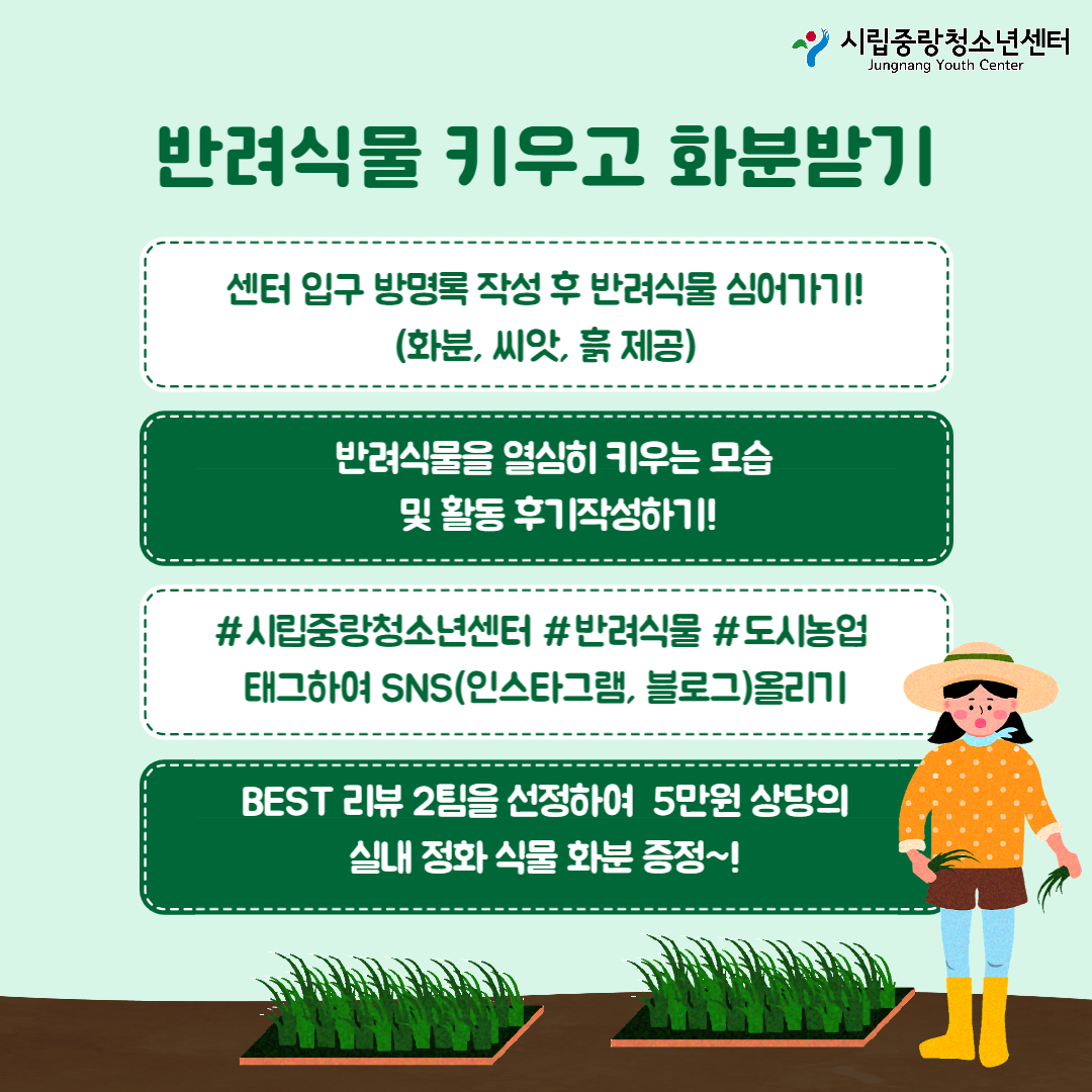 센터에 방문하셔서 반려식물(화분, 흙, 씨앗 제공)을 심어가가신 후 멋진 후기를 작성해 주시는 분들을 추첨하여 실내 공기정화식물 화분(5만원 상당)을 드립니다.