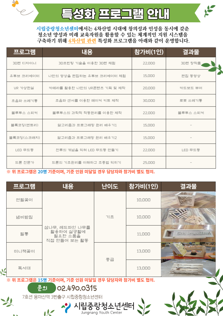 시립중랑청소년센터 특성화 프로그램(4차산업, 목공) 안내