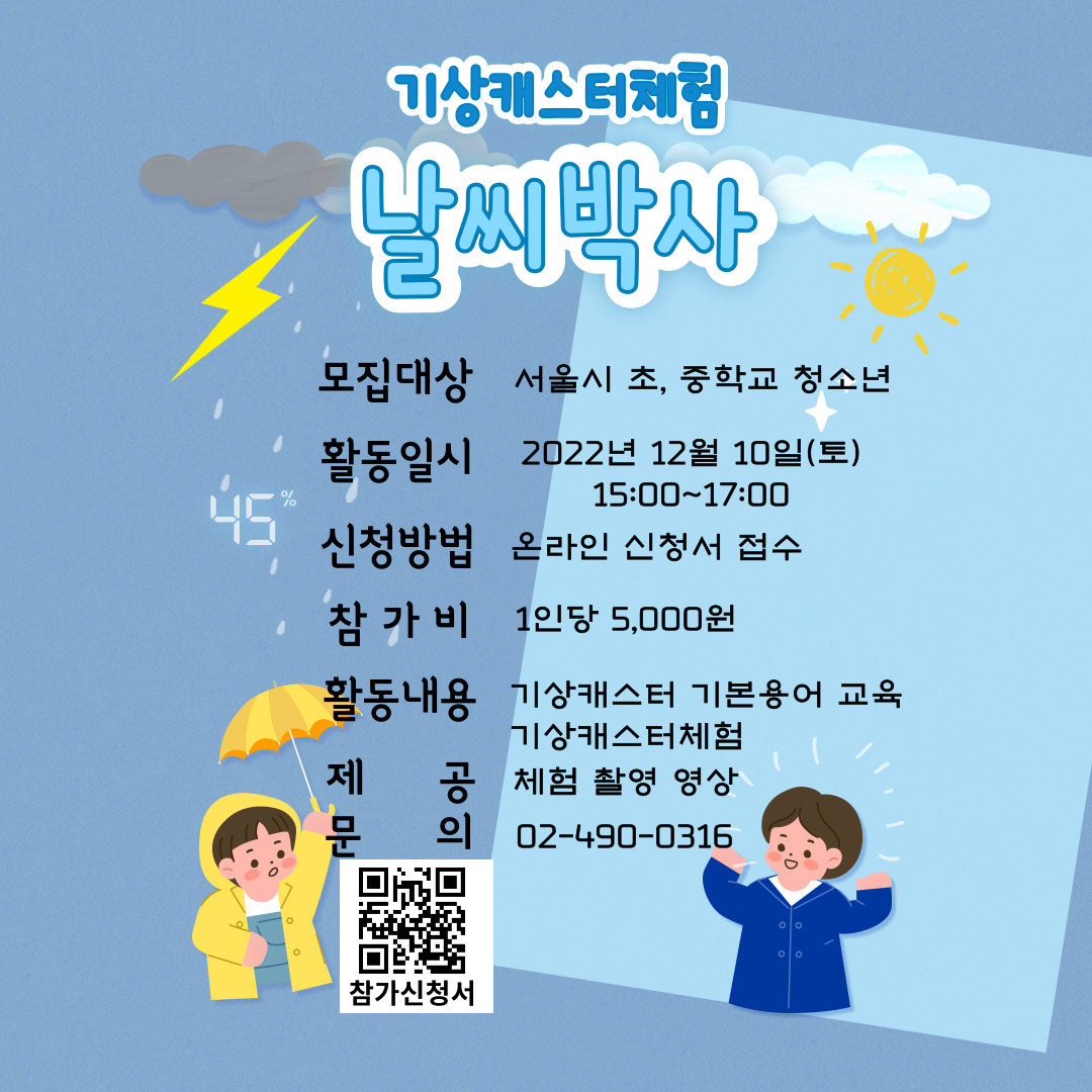 직접 대본을 작성하여 카메라와 TV를 통해서 비춰지며 오늘의 날씨를 알려주는 기상캐스터가 될 수 있는 프로그램입니다.