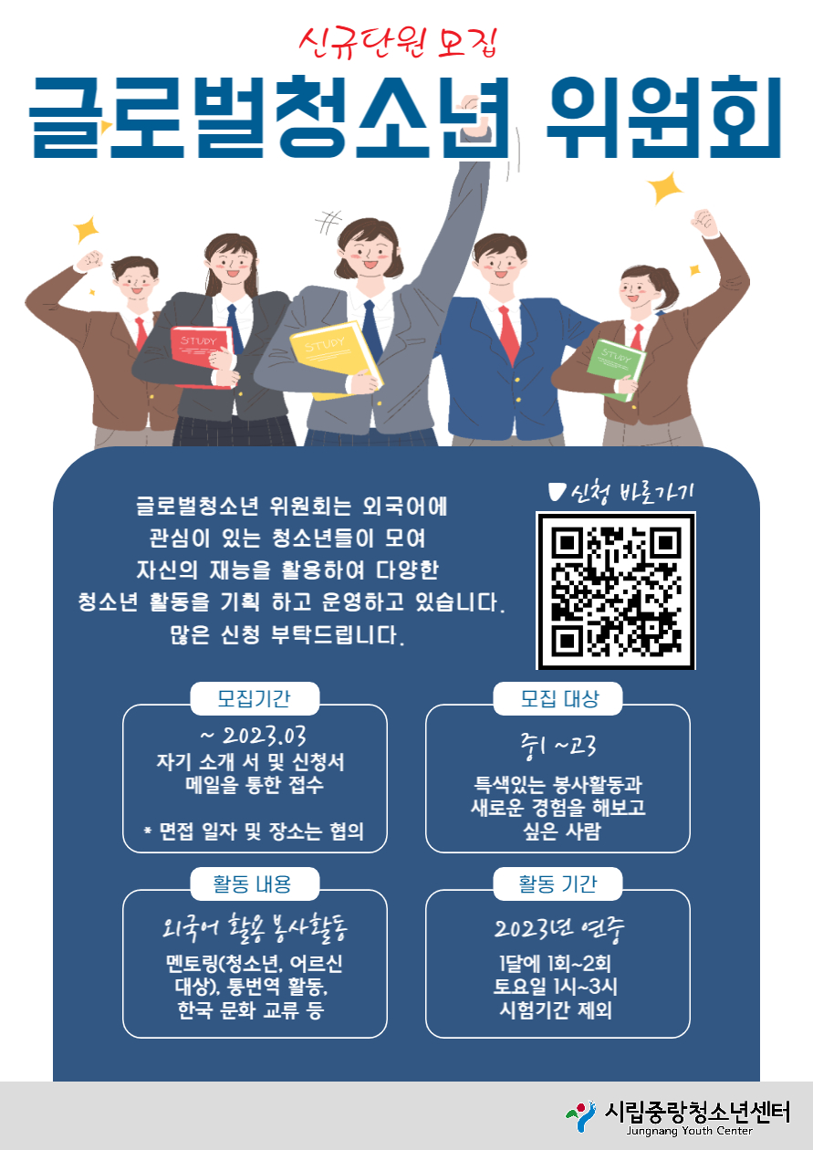 글로벌청소년위원회는 외국어에 관심과 재능이 있는 청소년들이 모여 각자 자신의 재능을 살려 멘토링 봉사활동, 통번역 봉사활동, 재능나눔 부스운영, 외국인 관광객에게 문화 알리기 등 다양한 컨텐츠 활동을 합니다.
