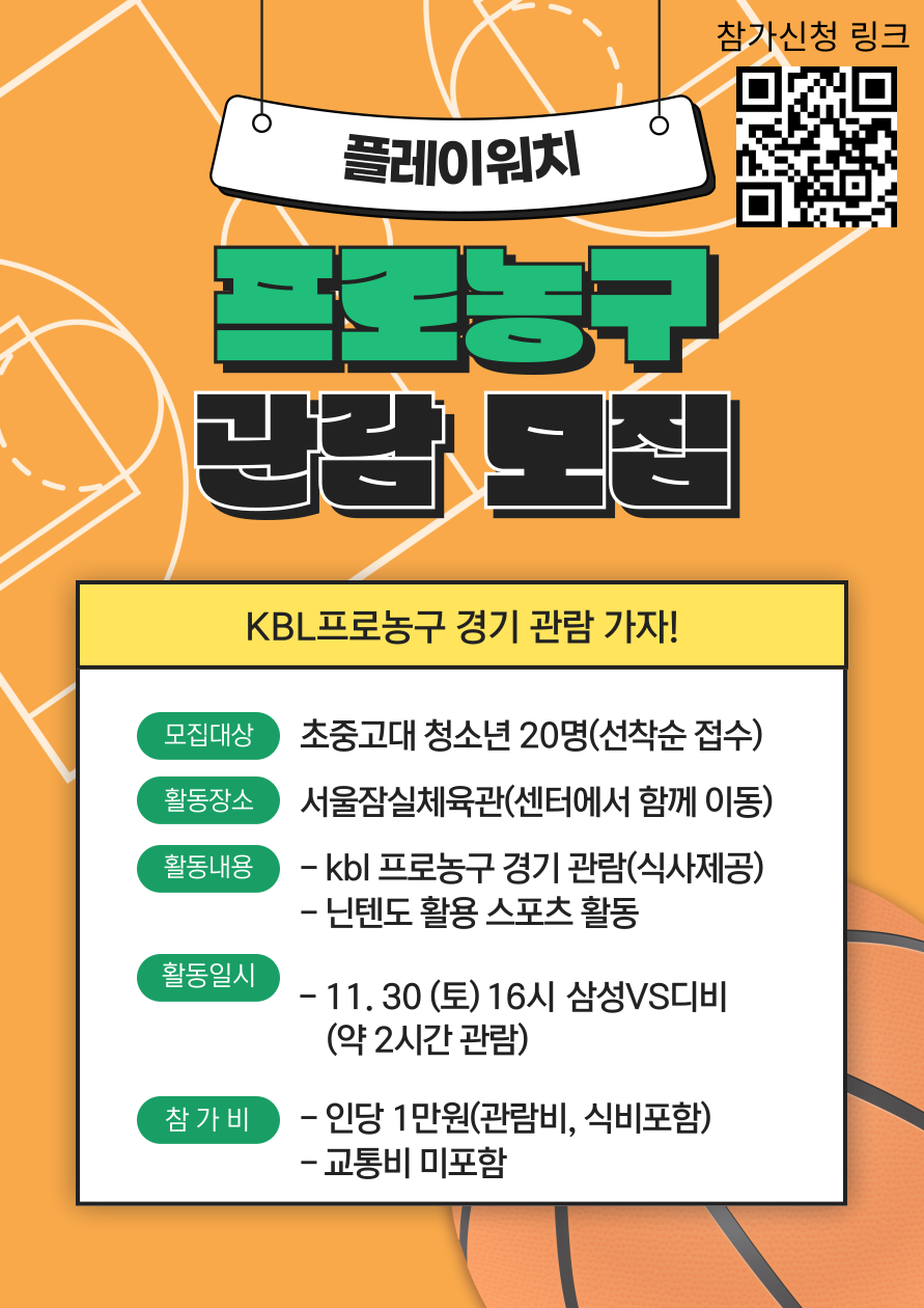 - 장소 : 잠실 체육관(센터에서 함께 이동) - 내용 : 프로 농구 경기 관람, 닌텐도를 활용한 스포츠 활동 - 참가비 : 1인 10,000원(식비, 티켓 구입비 등 포함)(교통비 개인 지참)