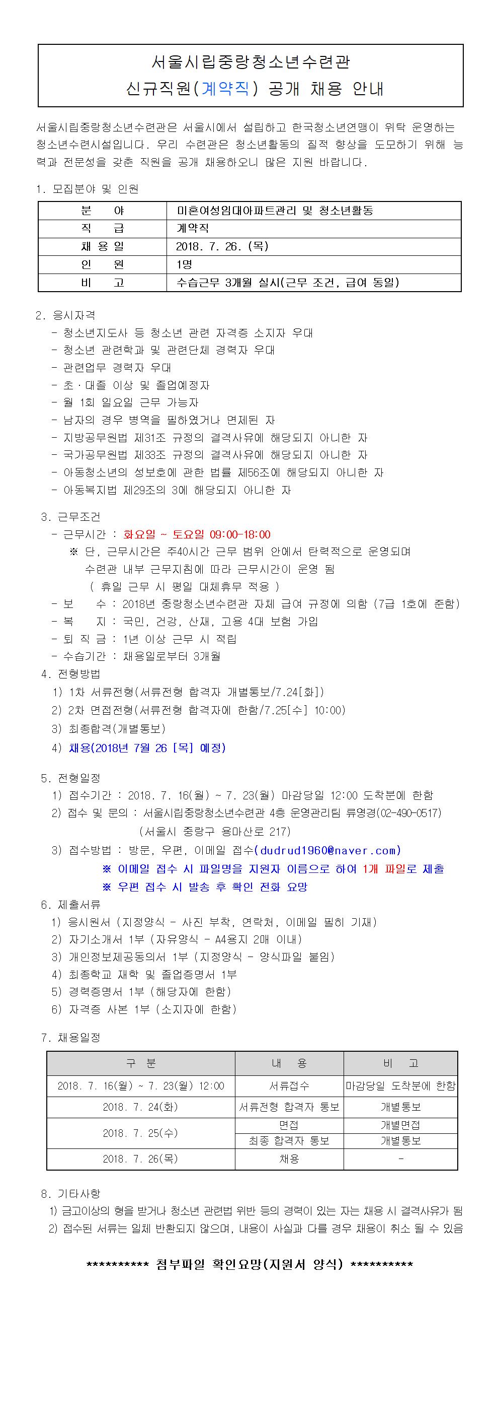 (마감)[재공고]중랑청소년수련관 신규직원(계약직) 공개 채용 안내 페이지 정보 작성자 관리자 댓글 0건 조회 3,662회 작성일 18-07-16 18:20 목록 본문 페이스북 공유 트위터 공유 이전글중랑청소년수련관 8월 시설안전점검 결과 18.08.09 다음글중랑청소년수련관 7월 시설안전점검 결과 18.07.06 댓글 0 댓글목록 등록된 댓글이 없습니다.