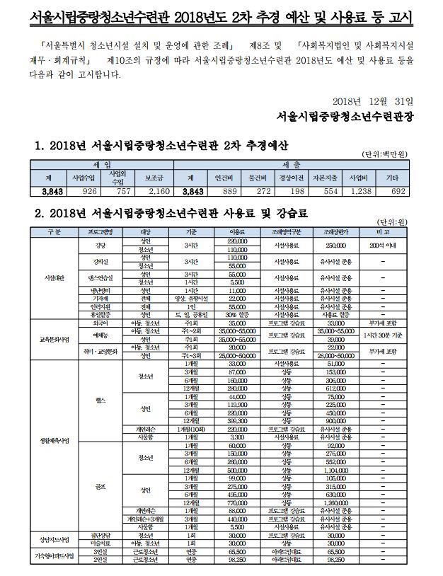 서울시립중랑청소년수련관 2018년도 2차 추경 예산 및 사용료 등 고시 페이지 정보 작성자 관리자 댓글 0건 조회 3,785회 작성일 19-01-07 17:45 목록 본문 페이스북 공유 트위터 공유 이전글[공지]중랑청소년수련관 신규직원(계약직) 최종합격자 공고 19.01.10 다음글서울시립중랑청소년수련관 2018년도 1차 추경 예산 및 사용료 등 고시 18.12.18 댓글 0 댓글목록 등록된 댓글이 없습니다.