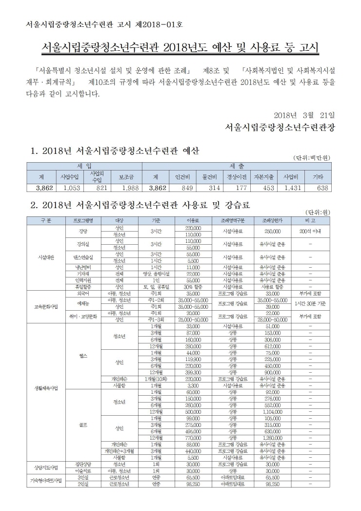 서울시립중랑청소년수련관 2018년도 예산 및 사용료 등 고시 페이지 정보 작성자 관리자 댓글 0건 조회 3,644회 작성일 18-03-21 10:28 목록 본문 페이스북 공유 트위터 공유 이전글서울시립중랑청소년수련관 2017년도 회계결산 공고 18.03.27 다음글(마감)*신규 문화강좌 4월 개강* 무료 청강의 기회 ! 18.03.16 댓글 0 댓글목록 등록된 댓글이 없습니다.