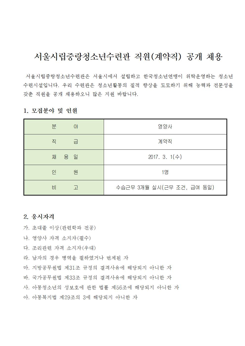 [공고]서울시립중랑청소년수련관 직원(계약직-영양사) 긴급 공개 채용 페이지 정보 작성자 관리자 댓글 0건 조회 3,535회 작성일 17-02-17 09:23 목록 본문 페이스북 공유 트위터 공유 이전글[공고] 신규 직원(안내데스크) 채용 17.03.06 다음글[공고]신규 직원(주방조리및보조) 긴급 공개 채용 연장(~8) 17.02.17 댓글 0 댓글목록 등록된 댓글이 없습니다.