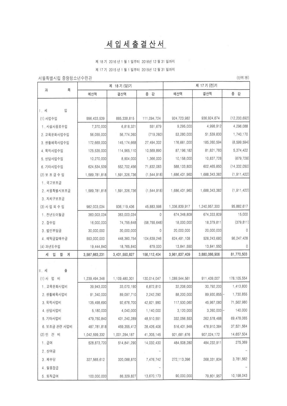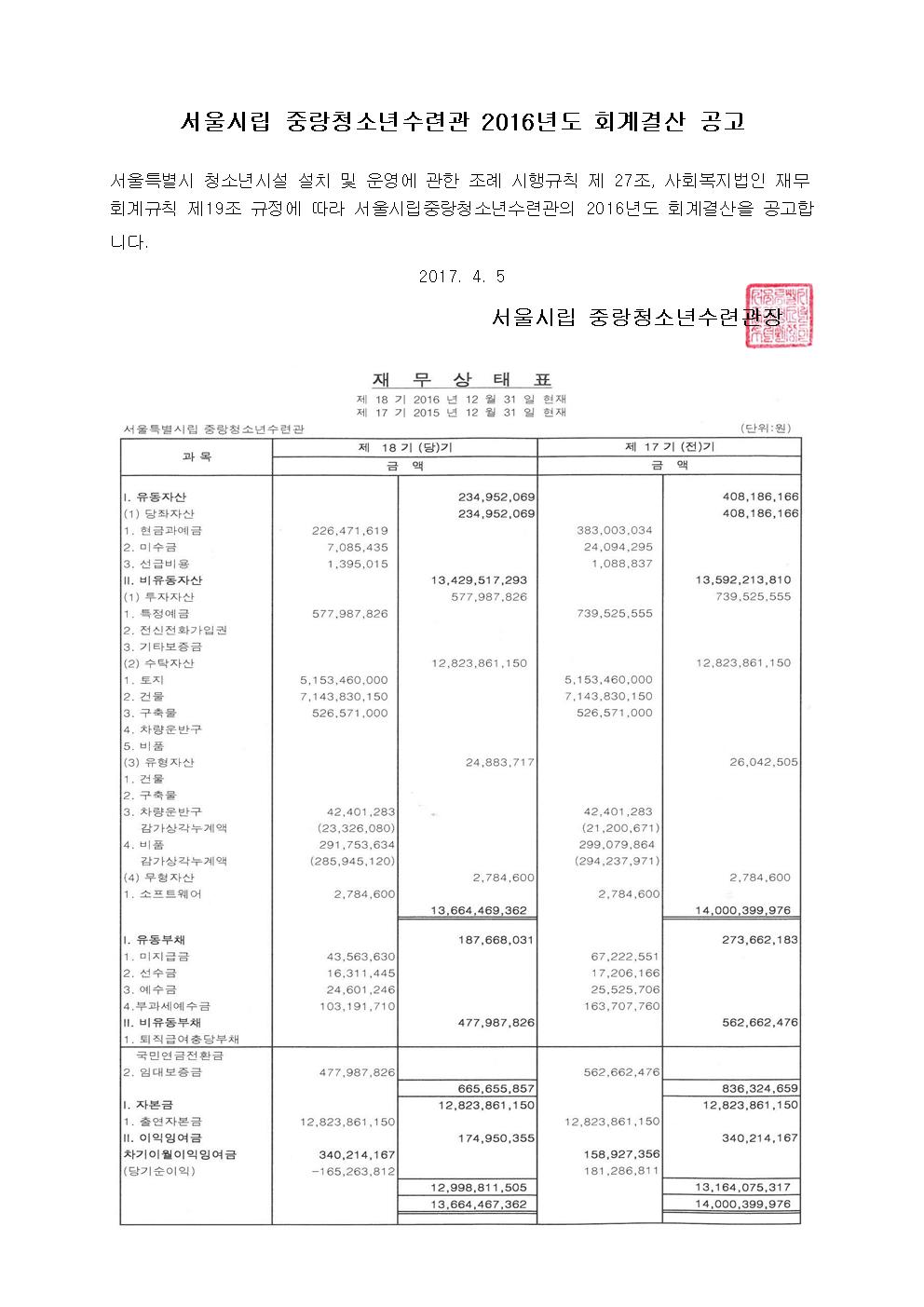 서울시립중랑청소년수련관 2016년도 회계결산 공고 페이지 정보 작성자 관리자 댓글 0건 조회 3,404회 작성일 17-04-05 09:50 목록 본문 페이스북 공유 트위터 공유 이전글2017년 4월 중랑청소년수련관 시설안전점검 결과 17.04.05 다음글[중랑청소년수련관] 안내데스크 정규(고용직)직원 긴급 채용 17.03.31 댓글 0 댓글목록 등록된 댓글이 없습니다.