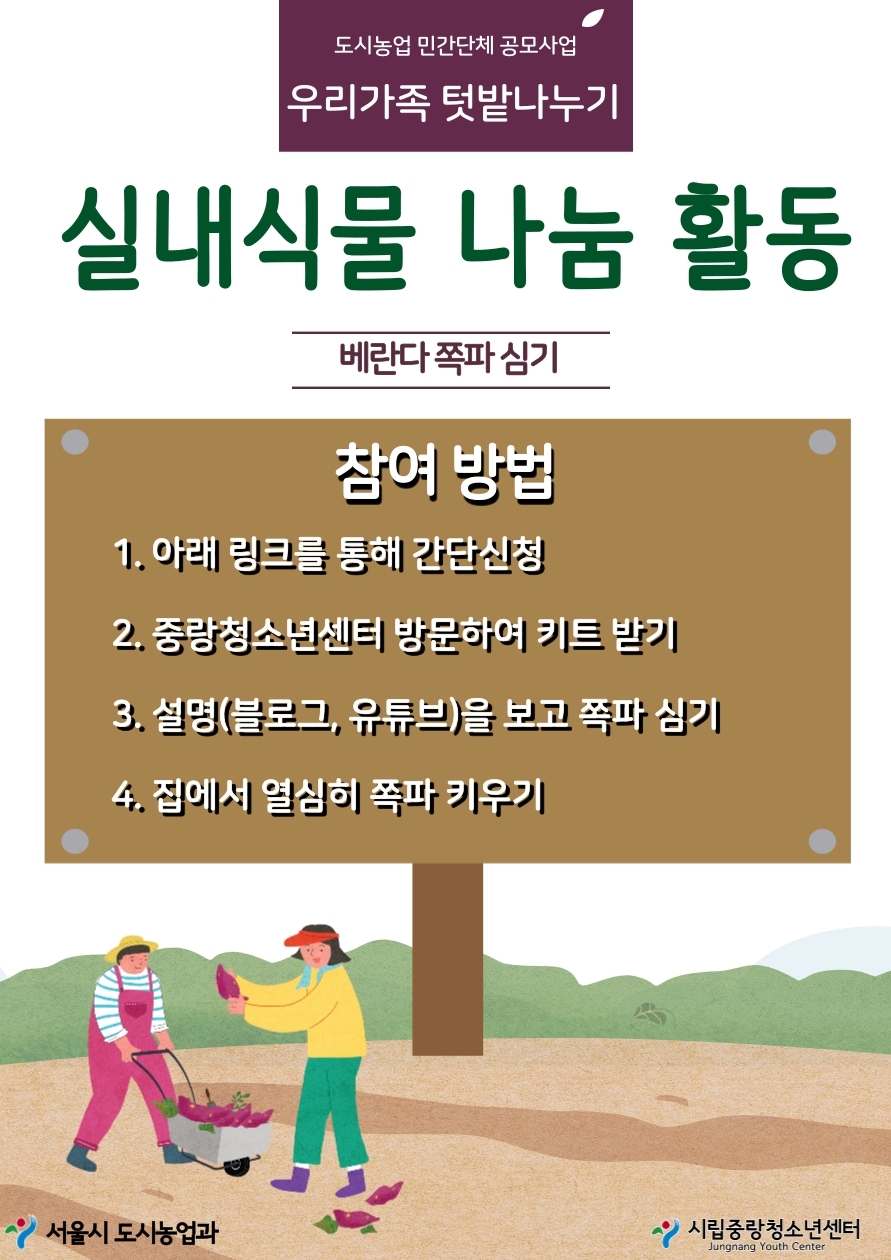 * 본사업은 서울시 도시농업과 '2020 도시농업 민간단체 공모사업'의 지원을 받아 운영되는 시립중랑청소년센터의 '우리가족텃밭나누기'사업입니다. 가족 행복 증진활동으로 가족텃밭 사업 및 도시농업 홍보 활동을 운영하고 있습니다.
