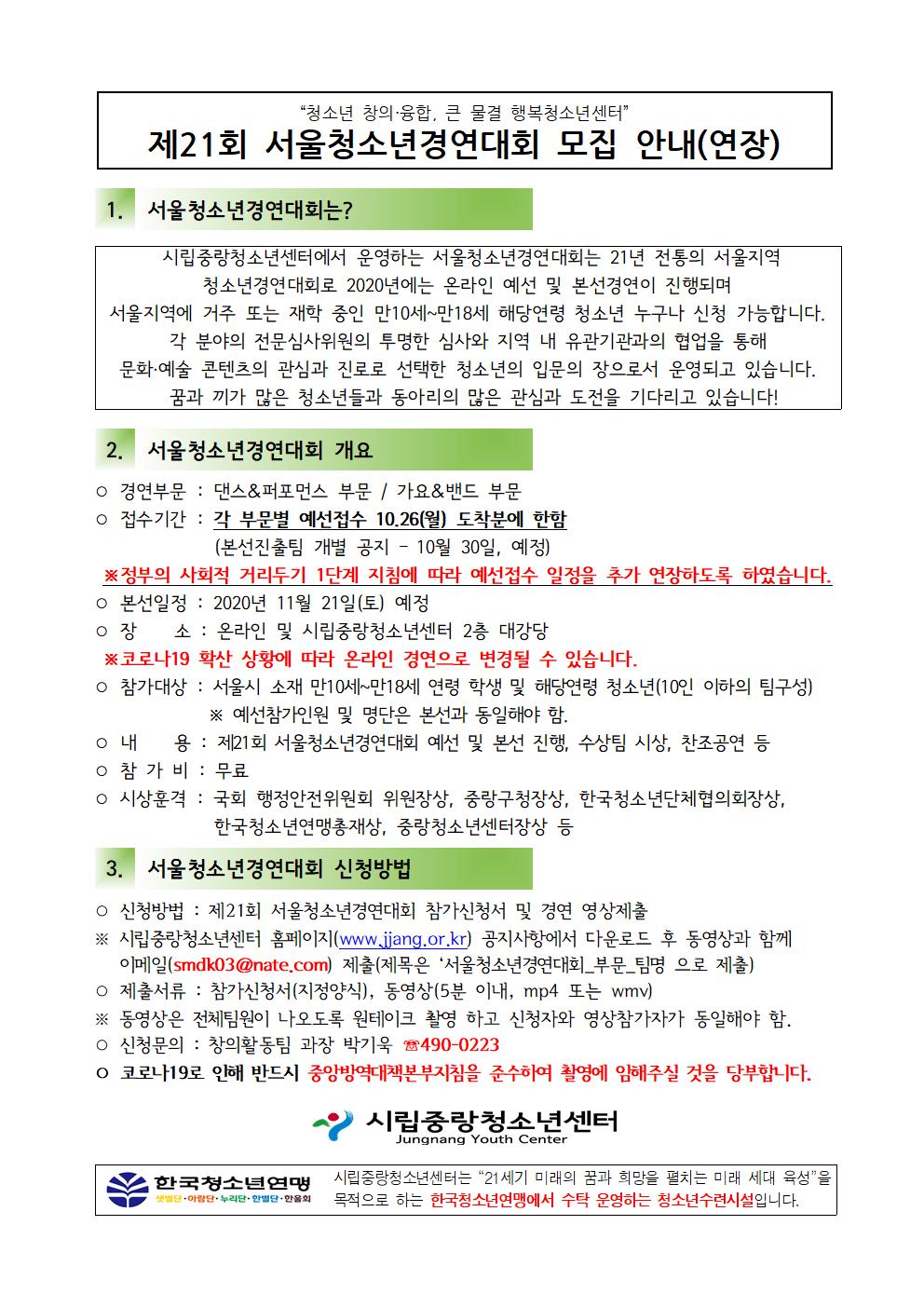 제21회 서울청소년경연대회 예선접수 연장 및 참가자모집