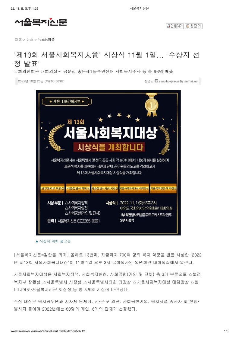 22-10-25 [서울복지신문]'제13회 서울사회복지大賞' 시상식 11월 1일... '수상자 선정 발표" 페이지 정보 작성자 관리자 댓글 0건 조회 1,022회 작성일 23-02-11 03:56 목록 본문 페이스북 공유 트위터 공유 기사 전문 보기 http://www.swnews.kr/news/articleView.html?idxno=50712 이전글23-1-14 [뉴스에듀신문외4건] 2023 글로벌 미래과학 겨울방학 동행캠프 23.02.11 다음글22-10-28[사회안전신문] ‘꿈다락 청소년 송캠프’ 발표회 11월 개최 23.02.11 댓글 0 댓글목록 등록된 댓글이 없습니다.