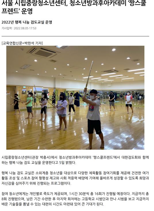 22-06-23 [교육연합신문 외7건] 2022년 행복 나눔 검도교실 운영 페이지 정보 작성자 관리자 댓글 0건 조회 953회 작성일 23-02-11 03:51 목록 본문 페이스북 공유 트위터 공유 기사 전문보기서울 시립중랑청소년센터, 청소년방과후아카데미 ‘짱스쿨프렌드’ 운영 – 교육연합신문 (eduyonhap.com)시립중랑청소년센터 청소년방과후아카데미 ‘짱스쿨프렌드’, 2022년 행복 나눔 검도교실 운영:보건의료연합신문 (hmnews.co.kr)시립중랑청소년센터 청소년방과후아카데미 ‘짱스쿨프렌드’, 2022년 행복 나눔 검도교실 운영:온 국민이 함께 보는 - 한국무예신문 (mooyenews.kr)시립중랑청소년센터 청소년방과후아카데미 ‘짱스쿨프렌드’, 2022년 행복 나눔 검도교실 운영 < 강사뉴스 < 기사본문 - 한국강사신문 (lecturernews.com)시립중랑청소년센터 청소년방과후아카데미 ‘짱스쿨프렌드’, 대한검도회와 함께 '행복 나눔 검도 교실' 운영 - 모든 교육은 웰뉴스에서 (wellnews.co.kr)시립중랑청소년센터 청소년방과후아카데미 ‘짱스쿨프렌드’, 2022년 행복 나눔 검도교실 운영 - 세이프뉴스 - 안전한 대한민국을 위해 함께해요! (safenews.co.kr) 이전글22-09-12 [한국무예신문 외3건] 아마란스 청소년 동아리 면목2동 자율방범대원 위한 머그컵 기부 활동 진행 23.02.11 다음글22-06-23 [교육연합신문 외6건] 호국보훈의 달 기념 청소년 뮤지컬 공연 개최 23.02.11 댓글 0 댓글목록 등록된 댓글이 없습니다.