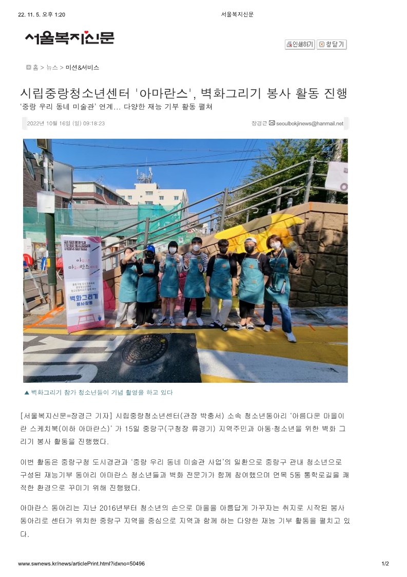 22-10-19 [서울복지신문외1건] '아마란스', 벽화그리기 봉사 활동 진행 페이지 정보 작성자 관리자 댓글 0건 조회 1,007회 작성일 23-02-11 03:54 목록 본문 페이스북 공유 트위터 공유 기사 전문 보기 http://www.swnews.kr/news/articleView.html?idxno=50496http://www.mooyenews.kr/sub_read.html?uid=15384 이전글22-10-20 [사회안전신문외1건] 찾아가는 도시농업 활동 지원 23.02.11 다음글22-09-12 [한국무예신문 외3건] 아마란스 청소년 동아리 면목2동 자율방범대원 위한 머그컵 기부 활동 진행 23.02.11 댓글 0 댓글목록 등록된 댓글이 없습니다.