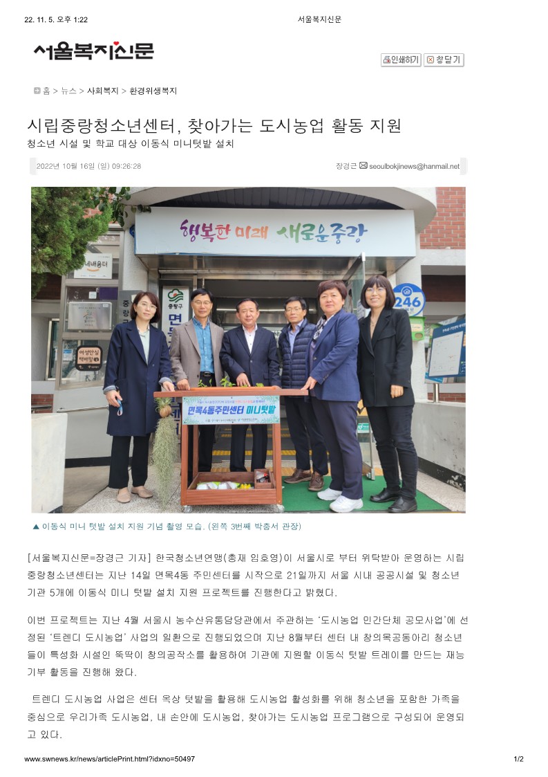22-10-20 [사회안전신문외1건] 찾아가는 도시농업 활동 지원 페이지 정보 작성자 관리자 댓글 0건 조회 1,033회 작성일 23-02-11 03:54 목록 본문 페이스북 공유 트위터 공유 기사전문보기 http://safenews.co.kr/n_news/news/view.html?no=29705http://www.swnews.kr/news/articleView.html?idxno=50497 이전글22-10-28[사회안전신문] ‘꿈다락 청소년 송캠프’ 발표회 11월 개최 23.02.11 다음글22-10-19 [서울복지신문외1건] '아마란스', 벽화그리기 봉사 활동 진행 23.02.11 댓글 0 댓글목록 등록된 댓글이 없습니다.