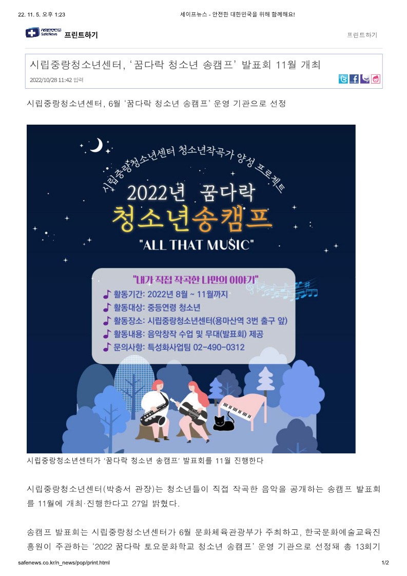 22-10-28[사회안전신문] ‘꿈다락 청소년 송캠프’ 발표회 11월 개최 페이지 정보 작성자 관리자 댓글 0건 조회 1,022회 작성일 23-02-11 03:55 목록 본문 페이스북 공유 트위터 공유 기사전문보기 http://safenews.co.kr/n_news/news/view.html?no=29755 이전글22-10-25 [서울복지신문]'제13회 서울사회복지大賞' 시상식 11월 1일... '수상자 선정 발표" 23.02.11 다음글22-10-20 [사회안전신문외1건] 찾아가는 도시농업 활동 지원 23.02.11 댓글 0 댓글목록 등록된 댓글이 없습니다.