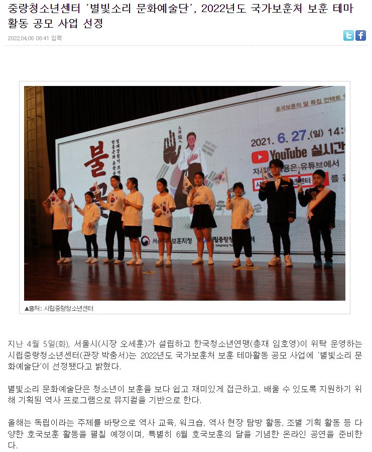 22-04-06 [well news] 별빛소리 문화예술단 국가보훈처 보훈 테마 활동 공모사업 선정 페이지 정보 작성자 관리자 댓글 0건 조회 938회 작성일 23-02-11 03:46 목록 본문 페이스북 공유 트위터 공유 중랑청소년센터 ‘별빛소리 문화예술단’, 2022년도 국가보훈처 보훈 테마활동 공모 사업 선정 - 모든 교육은 웰뉴스에서 (wellnews.co.kr)http://www.mooyenews.kr/sub_read.html?uid=14502 이전글22-06-23 [교육연합신문 외6건] 호국보훈의 달 기념 청소년 뮤지컬 공연 개최 23.02.11 댓글 0 댓글목록 등록된 댓글이 없습니다.