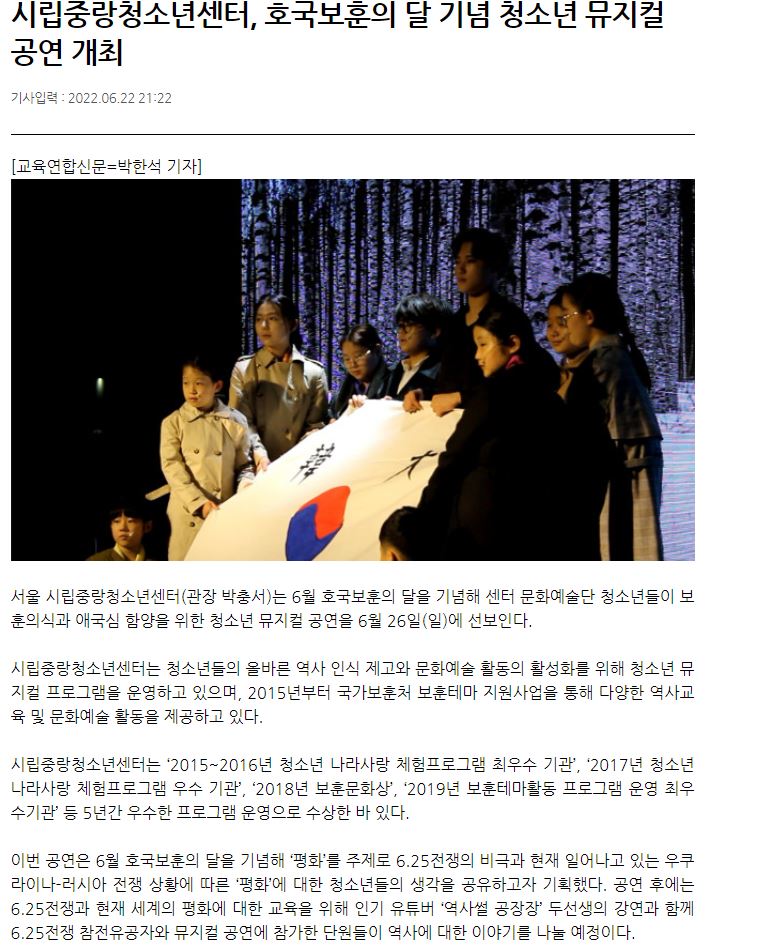 22-06-23 [교육연합신문 외6건] 호국보훈의 달 기념 청소년 뮤지컬 공연 개최 페이지 정보 작성자 관리자 댓글 0건 조회 958회 작성일 23-02-11 03:50 목록 본문 페이스북 공유 트위터 공유 기사 전문보기1. http://www.eduyonhap.com/news/view.php?no=64309#none;2. http://www.wellnews.co.kr/news/view.html?section=124&category=130&no=46153. https://media1.or.kr/06/170792/4. http://www.mooyenews.kr/sub_read.html?uid=148305. http://safenews.co.kr/n_news/news/view.html?no=291216. http://koreaarttv.com/detail.php?number=763297. https://www.ibabynews.com/news/articleView.html?idxno=105933 이전글22-06-23 [교육연합신문 외7건] 2022년 행복 나눔 검도교실 운영 23.02.11 다음글22-04-06 [well news] 별빛소리 문화예술단 국가보훈처 보훈 테마 활동 공모사업 선정 23.02.11 댓글 0 댓글목록 등록된 댓글이 없습니다.