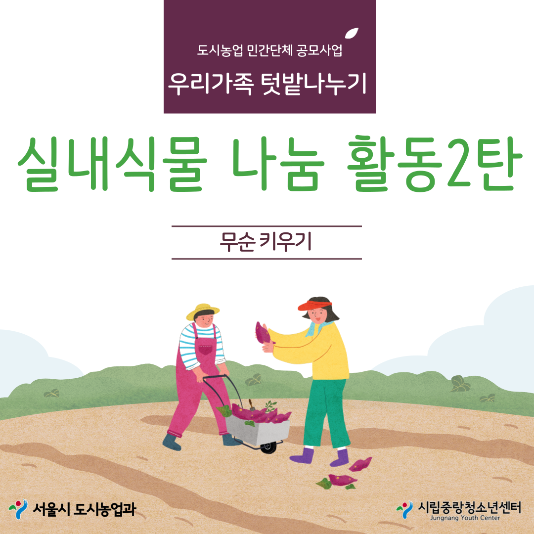 * 본사업은 서울시 도시농업과 '2020 도시농업 민간단체 공모사업'의 지원을 받아 운영되는 시립중랑청소년센터의 '우리가족텃밭나누기'사업입니다. 가족 행복 증진활동으로 가족텃밭 사업 및 도시농업 홍보 활동을 운영하고 있습니다.